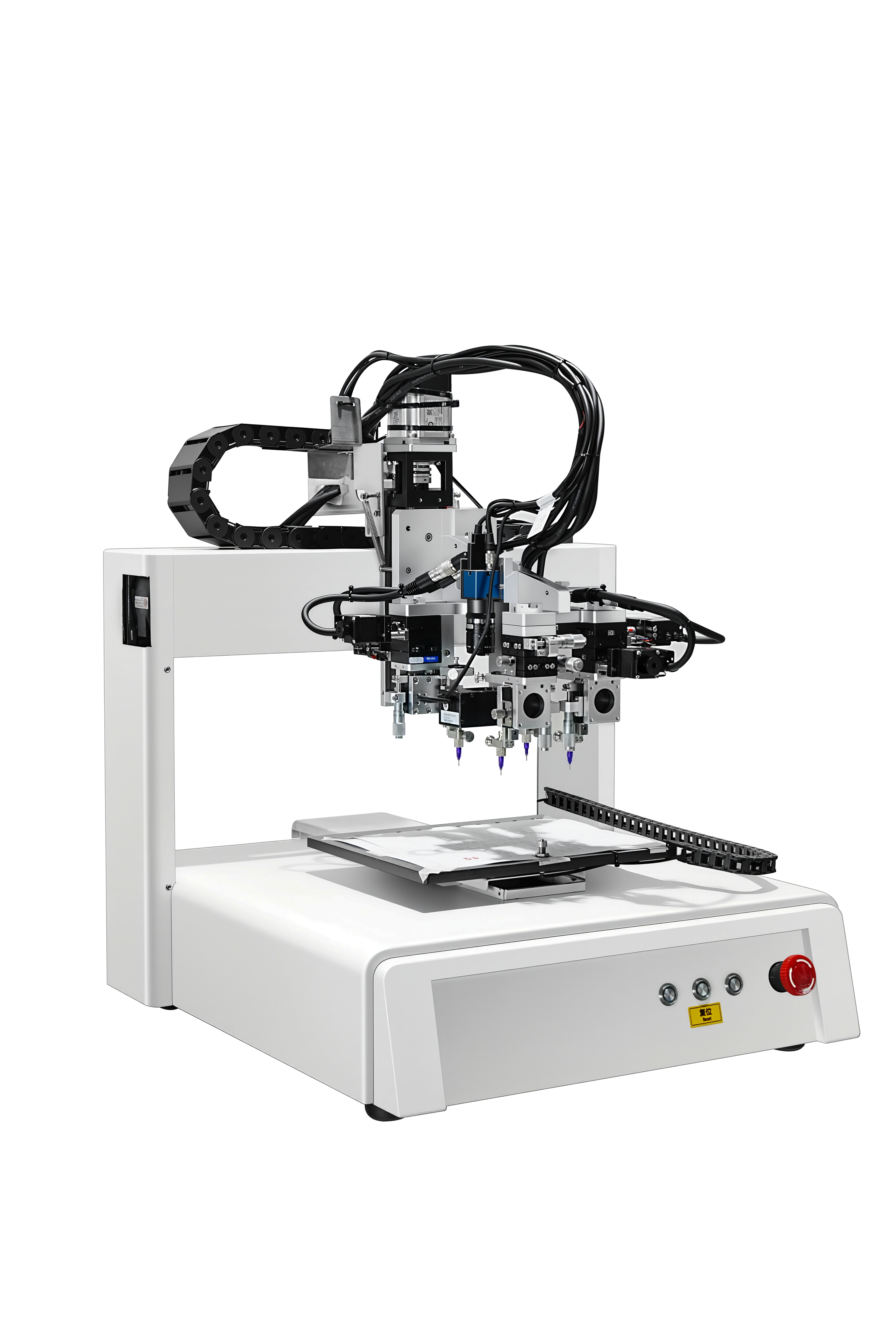 飞拍多头,自动校准,高精度视觉定位系统,自动识别并校准产品位置,多点胶头自动调整各自的位置偏差,精准点胶或喷胶。